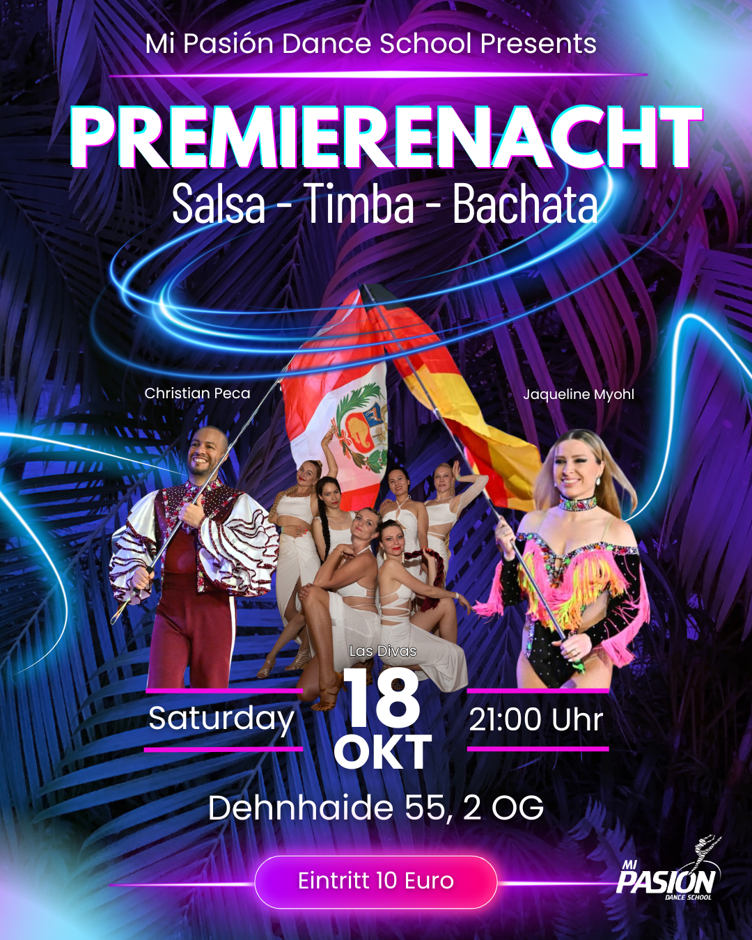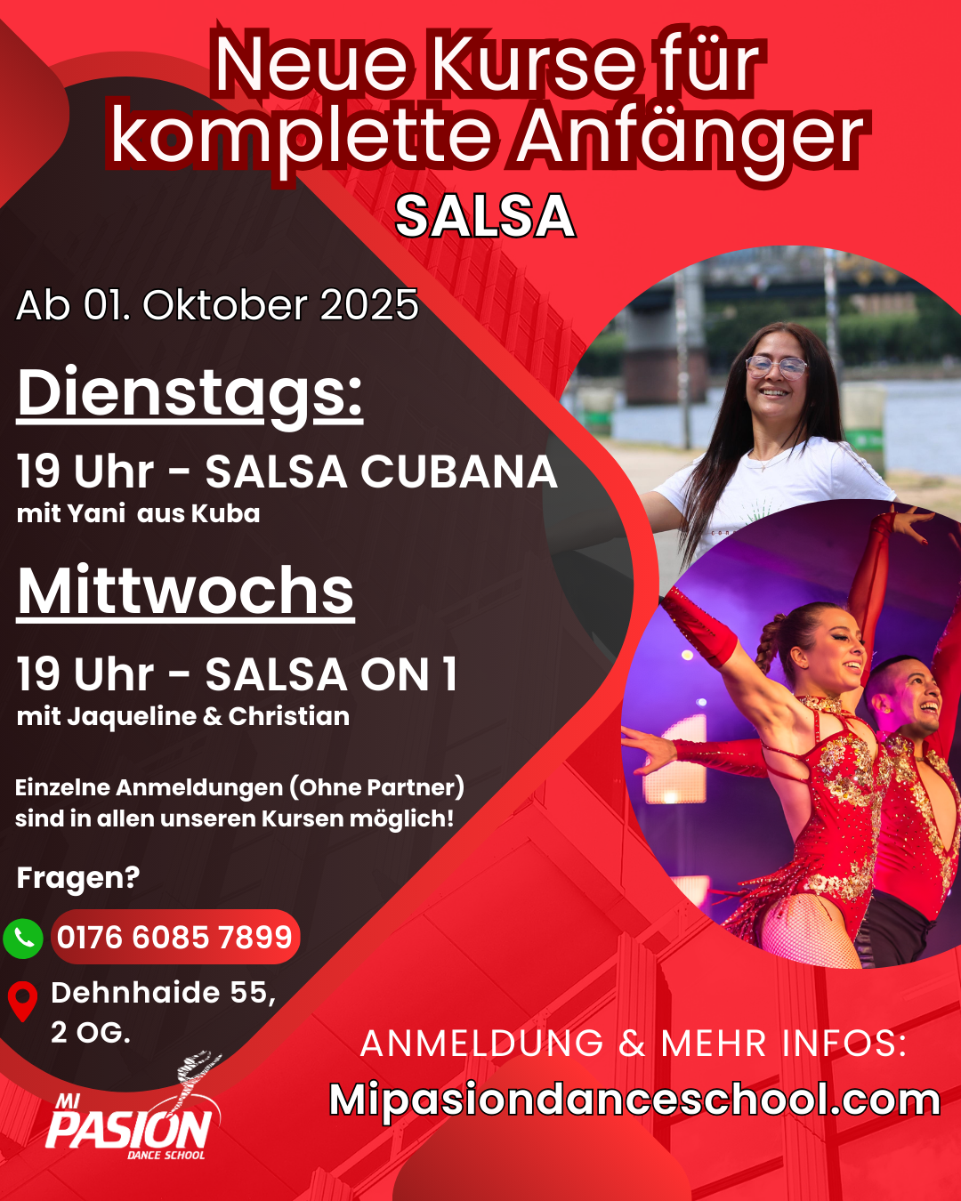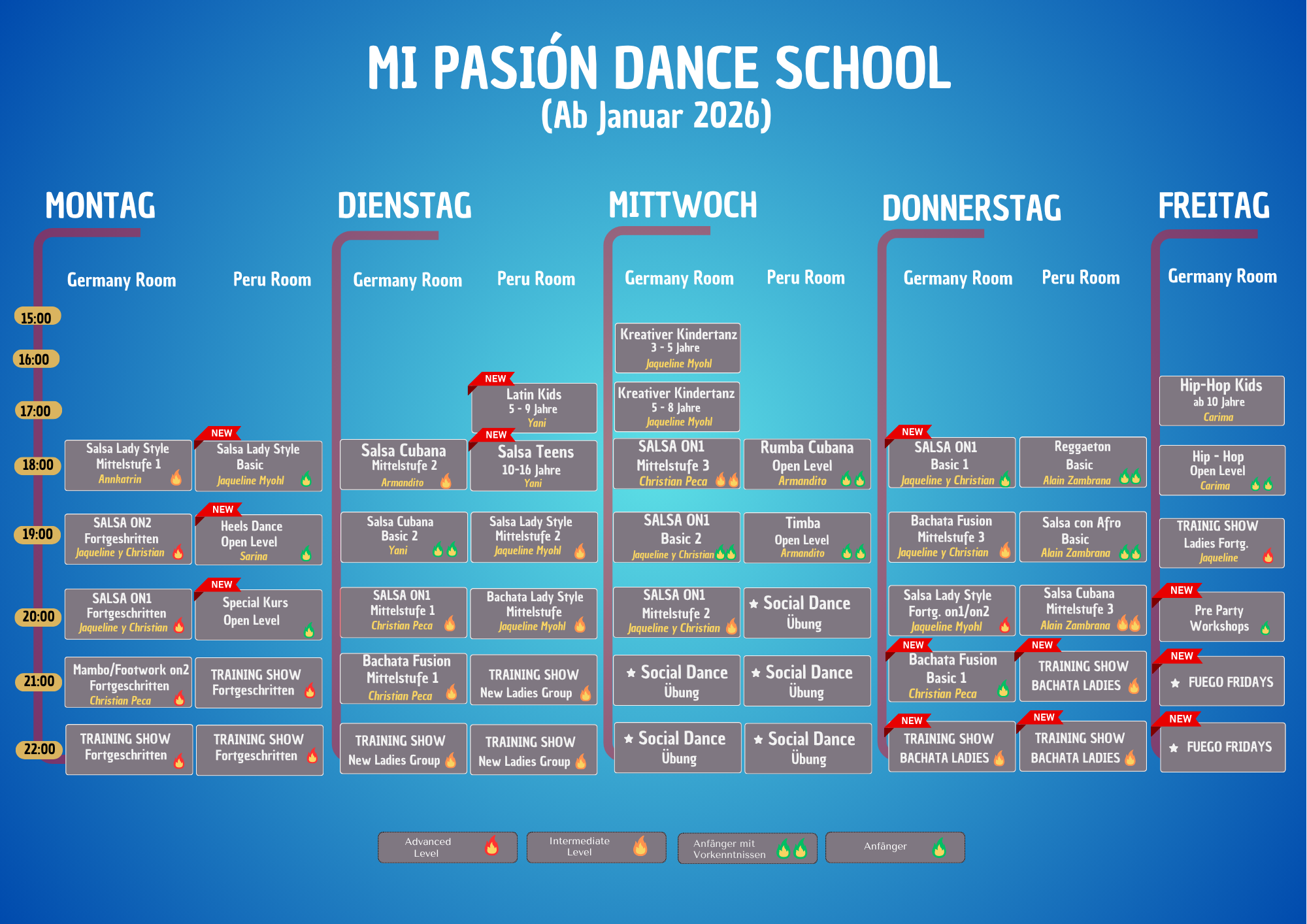 Unser Schwerpunkt liegt in der Entwicklung des Gesellschafts- und Turniertanzes in den Tanzrichtungen Salsa & Bachata. Unsere internationalen Trainer, unter anderem mehrfache Deutsche Meister, unterstützen die Sportler dabei mithilfe von neuesten Lehrmethoden und motivieren so jeden Tag aufs Neue zu Erfolgen. Unter der Leitung von Jaqueline Myohl und Christian Peca, wird es bei Mi Pasion Dance School auf 3 Sprachen – Deutsch, Spanisch und Englisch- engagiert unterrichtet. Der Weg eines Schülers zum ersten Turnier ist sehr individuell. Einerseits, kann man durch die zahlreichen Feste und Aufführungen in Hobbygruppen und Wahlunterricht in der Tanzschule sich stetig weiterentwickeln. Andererseits, kann man auch zum ersten Turnier gleich nach einem harten zwei-/dreimonatigen Training mit Profis teilnehmen. Jeder wählt seinen eigenen Weg, so wie es einem liegt!