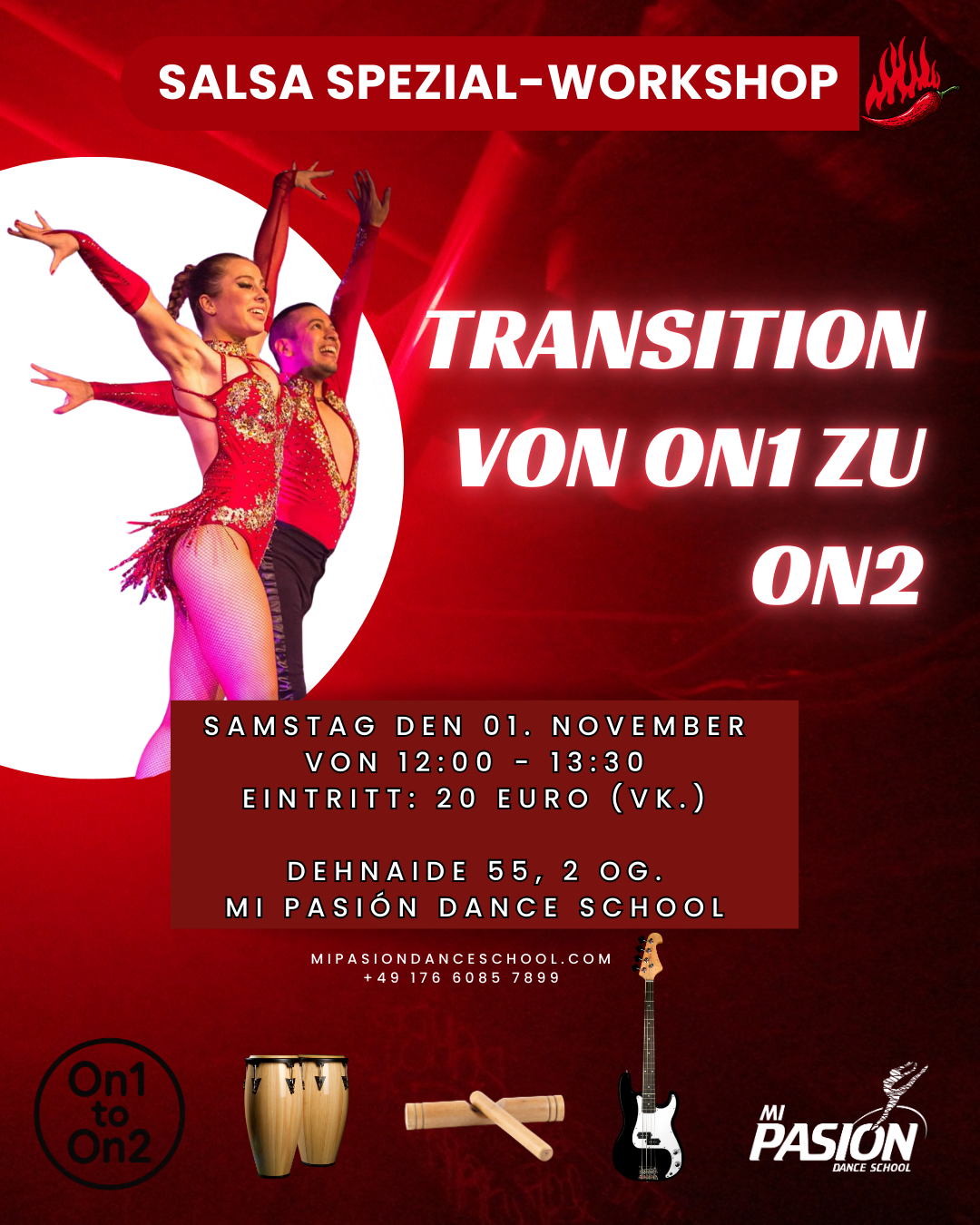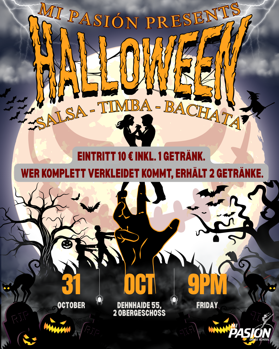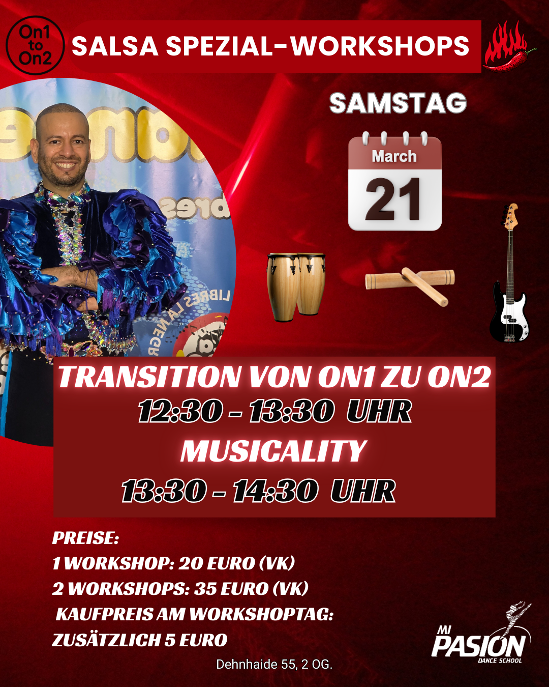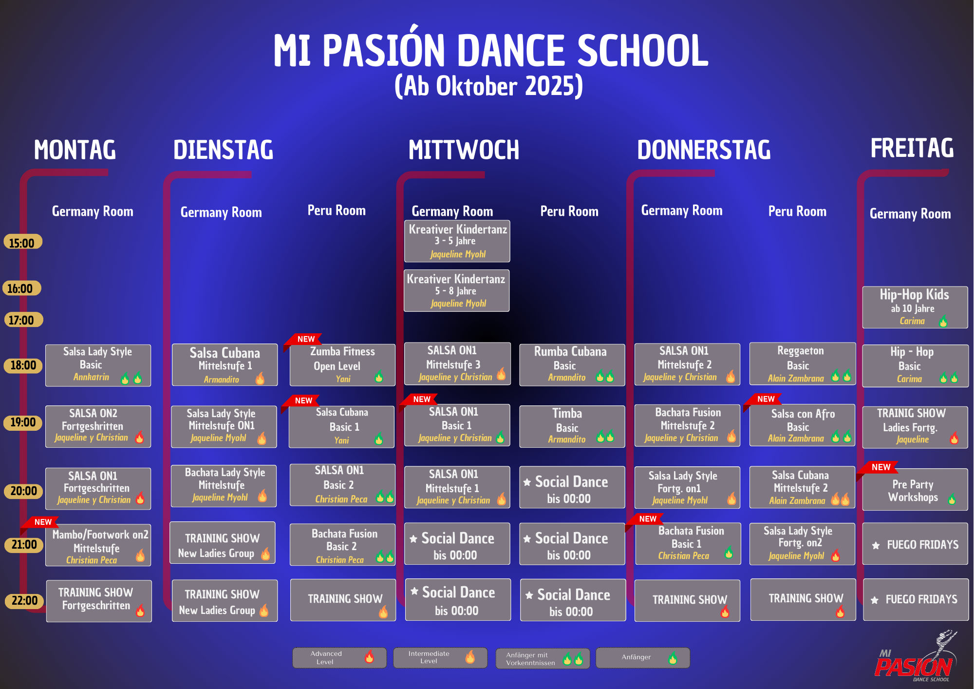Unser Schwerpunkt liegt in der Entwicklung des Gesellschafts- und Turniertanzes in den Tanzrichtungen Salsa & Bachata. Unsere internationalen Trainer, unter anderem mehrfache Deutsche Meister, unterstützen die Sportler dabei mithilfe von neuesten Lehrmethoden und motivieren so jeden Tag aufs Neue zu Erfolgen. Unter der Leitung von Jaqueline Myohl und Christian Peca, wird es bei Mi Pasion Dance School auf 3 Sprachen – Deutsch, Spanisch und Englisch- engagiert unterrichtet. Der Weg eines Schülers zum ersten Turnier ist sehr individuell. Einerseits, kann man durch die zahlreichen Feste und Aufführungen in Hobbygruppen und Wahlunterricht in der Tanzschule sich stetig weiterentwickeln. Andererseits, kann man auch zum ersten Turnier gleich nach einem harten zwei-/dreimonatigen Training mit Profis teilnehmen. Jeder wählt seinen eigenen Weg, so wie es einem liegt!